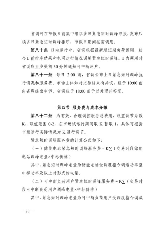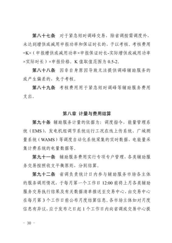 對于緊急短時調(diào)峰交易,除省調(diào)按需調(diào)度外,未達到增供或減用申報功率和保證時長的,予以考核??己速M用=K×(申報增供或減用功率×申報保證時長-實際增供或減用功率×實際時長)×申報價格,K值取值范圍為0.5-2。