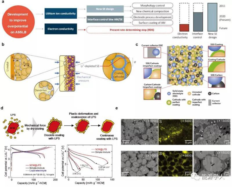 圖3. a)ASSLBs和b)常規(guī)液體LIBs的橫截面SEM;c)ASSLBs的合理電極示意圖;d)減少ASSLBs整體過電位的未來研究方向示意圖