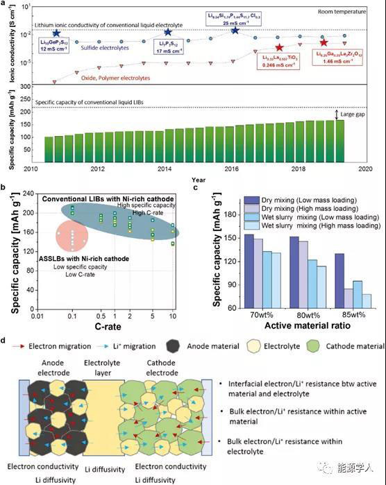 此外,如圖1b所示,傳統(tǒng)LIBs的電化學(xué)測(cè)試能夠以不同的倍率進(jìn)行,而大多數(shù)ASSLBs的測(cè)試只能以較低的倍率(0.1C)進(jìn)行。而且,作為決定能量密度關(guān)鍵因素的ASSLBs電極仍然面臨諸如活性材料比、負(fù)載水平和制造方法的挑戰(zhàn)。對(duì)于ASSLB,大多數(shù)先前的研究都采用了干混合電極制造方法,該方法由于其機(jī)械不穩(wěn)定性而不適用于大規(guī)模生產(chǎn)。而常規(guī)的液體LIBs采用濕漿料混合電極的制造方法,不僅適用于大規(guī)模生產(chǎn),還有利于形成良好的界面接觸。更重要的是,為了獲得高能量密度,大多數(shù)常規(guī)液體LIBs不僅增加了電極的活性物質(zhì)比例,而且提高了電極的負(fù)載。低比容量、低電流密度和溫和電極條件的挑戰(zhàn)阻礙了ASSLBs的實(shí)際應(yīng)用。此外,在ASSLBs中,鋰離子和電子要通過活性物質(zhì)、SEs以及活性物質(zhì)與SEs的界面,因此,活性材料和SE之間的界面電阻是不可避免的。為了解決這些關(guān)鍵問題,促進(jìn)ASSLBs的實(shí)際應(yīng)用,應(yīng)該將研究重點(diǎn)集中在降低ASSLBs的界面電阻和體電阻,并提高ASSLBs電極內(nèi)的離子和電子電導(dǎo)率上,這是容量和功率密度的關(guān)鍵因素。