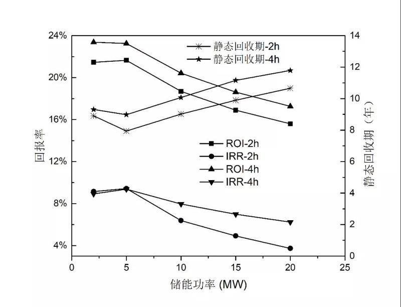圖4. 不同規(guī)模不同時(shí)長儲(chǔ)能投資回報(bào)率和回收期