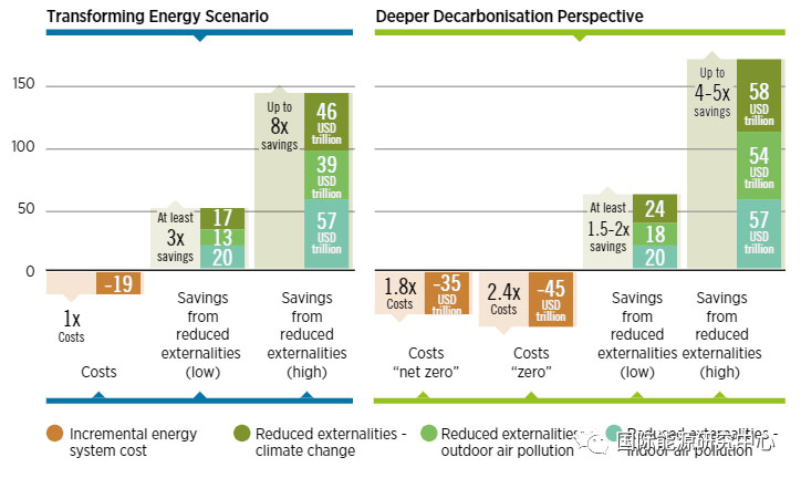 2、加快可再生能源部署和提高能效回報將遠大于投入。按照“轉(zhuǎn)型能源情景”,能源轉(zhuǎn)型每花費1美元,將獲得3-8美元的投資回報(圖5)。換言之,到2050年“轉(zhuǎn)型能源情景”將增加19萬億美元的成本,但通過降低環(huán)境和健康損害,將獲得50-142萬億美元的回報。要實現(xiàn)凈零排放,“更深度脫碳情景”將需再增加16萬億美元投入,如果實現(xiàn)完全無排放則將增加26萬億美元成本,但零碳排放帶來的收益將達到62-169萬億美元。另一種衡量成本的方法是在此期間減少一噸碳排放的成本。對于“轉(zhuǎn)型能源情景”,該成本為34美元/噸,對于“更深度脫碳情景”凈零排放,成本為100美元/噸,對于“更深度脫碳情景”完全零排放,成本為156美元/噸。