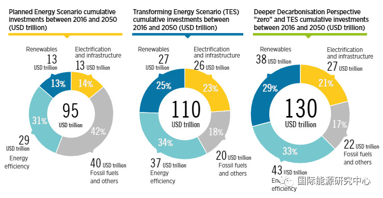 1、為了確保氣候安全,需要擴大對清潔能源技術(shù)的投資并轉(zhuǎn)變投資方向。需要將化石燃料投資轉(zhuǎn)向可再生能源和能效,逐步取消化石燃料補貼。到2050年,“轉(zhuǎn)型能源情景”中能源系統(tǒng)總投資需要達到110萬億美元,約占同期年均GDP的2%。其中,超過80%的資金應(yīng)投資可再生能源、能效、終端用能電氣化以及電網(wǎng)和靈活性。如果以年度計算,每年的投資水平應(yīng)達到約3.2萬億美元。相比之下,2014-2018年期間平均每年的投資約為1.8萬億美元,而在“已規(guī)劃能源情景”下未來將達到2.9萬億美元/年。如果希望實現(xiàn)“零碳排放”,到2050年對能源系統(tǒng)總投資需要達到130萬億美元(見圖4)。
