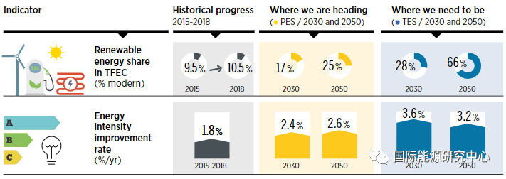 4、作為降低碳排放的主要解決方案,能效和可再生能源需加速部署。能效和可再生能源是實現(xiàn)全球能源轉(zhuǎn)型的兩個關(guān)鍵解決方案。然而,由于能源需求持續(xù)增長,2010年以來可再生能源在全球終端能源消費中所占的份額僅在10%左右緩慢增長。2019年能源強度僅增長1.2%,低于過去十年的平均水平(1.8%)。按照“轉(zhuǎn)型能源情景”,可再生能源、能效和電氣化將共同貢獻90%的能源相關(guān)減排量,可再生能源在終端能源消費占比到2030年應(yīng)增至28%,到2050年需達到66%,而能源強度改善速度需提高到每年3.2%,才能滿足全球氣候目標(biāo)(圖3)。