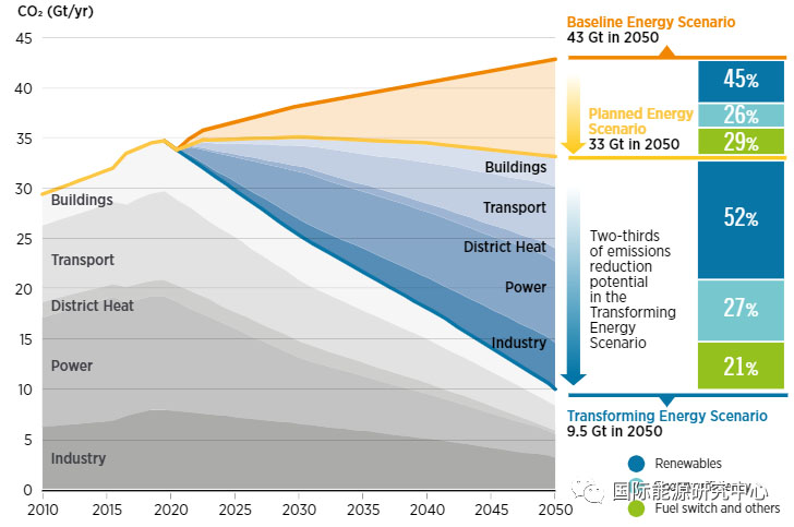 3、到2050年,能源相關(guān)碳排放平均每年需要下降3.8%,可再生能源和能效將做出巨大貢獻。按照“轉(zhuǎn)型能源情景”,到2050年能源相關(guān)碳排放將比今天的水平下降70%,其中一半以上的減排量來自可再生能源(包括發(fā)電和終端用能部門),約1/4來自能效,加上直接和間接電氣化(例如綠色氫能和電動汽車等技術(shù)),共可貢獻90%以上的減排量(圖2)。按照“更深度脫碳情景”,剩余的減排量(其中2/3以上來自航空、船運和重工業(yè)等具有挑戰(zhàn)性的部門),主要依靠增加可再生能源、電氣化(直接使用和綠色氫能)、進一步提升能效、采用碳管理以及其他消費習(xí)慣的改變等來完成。在能源領(lǐng)域以外,還需要努力減少非能源使用產(chǎn)生的排放,土地使用、土地利用變化和林業(yè)產(chǎn)生的排放以及煤炭、石油和天然氣行業(yè)中的氣體排放。
