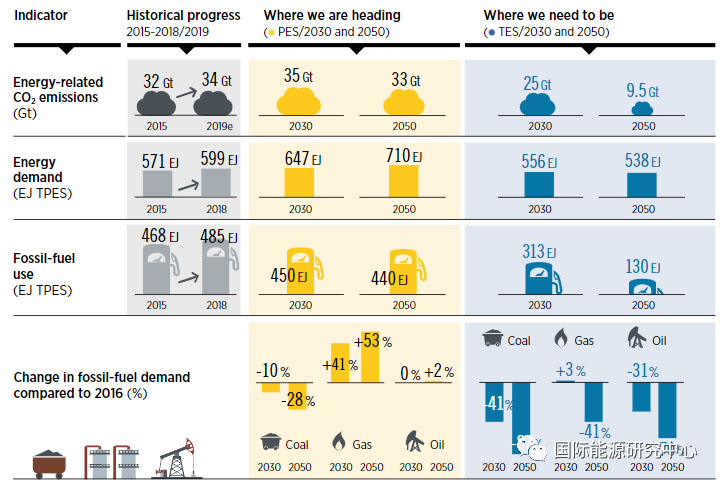 圖1:到2050年全球一次能源需求、化石燃料需求以及能源相關(guān)碳排放變化