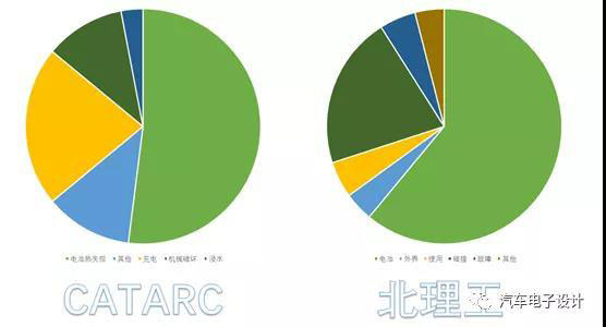 不同的統(tǒng)計顯示,電池問題是起火事故很大的直接原因。北理工的統(tǒng)計占61%,CATARC的統(tǒng)計占52%,由于兩家單位都直接參與到事故的調(diào)查和原因認(rèn)定的程序中,所以這個統(tǒng)計的意義還是很明確的。
