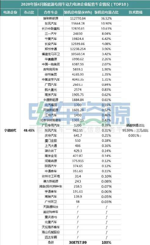 從參與配套的動力電池生產(chǎn)企業(yè)來看,1-4月,寧德時(shí)代裝機(jī)量市場占比為49.45%,相當(dāng)于一季度裝機(jī)量的總和。國軒高科、力神電池、鵬輝能源和比亞迪,其裝機(jī)量占比分別為17.1%、7.2%、5.59%、4.15%。值得注意的是,比亞迪1-4月裝機(jī)量較去年同期下滑96.89%。