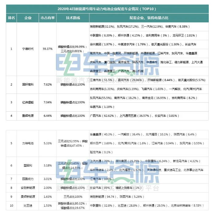 從專用車動力電池企業(yè)的配套情況來看,4月,寧德時(shí)代配套31家車企,在專用車的市場占有率高達(dá)59.37%,幾乎所有配套的車型均采用磷酸鐵鋰電池。