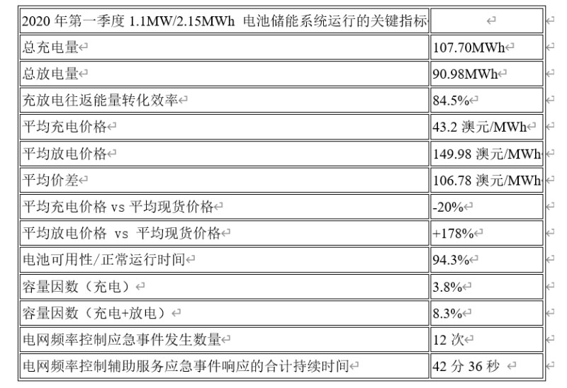 下表提供了這個(gè)用戶側(cè)儲(chǔ)能系統(tǒng)的關(guān)鍵性能指標(biāo)。需要注意的是,儲(chǔ)能系統(tǒng)的充放電往返能量轉(zhuǎn)化效率為84.5%,雖然在正常條件下略低于制造商規(guī)定的86.5%,但其中包括輔助負(fù)載,并且受到電池容量有所減少和影響。此外,澳大利亞的第一季度是一年中最熱的幾個(gè)月,因此輔助的冷負(fù)荷要求最高,耗費(fèi)更多的電力。