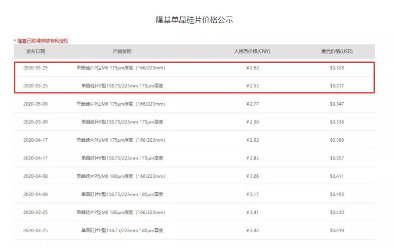 2020年3月25日,隆基單晶硅片發(fā)布降價公示,單晶硅片P型M6 180μm厚度(166/223mm),由3.47元/片降至3.41元/片,單晶硅片P型M2 180μm厚度,價格維持不變。