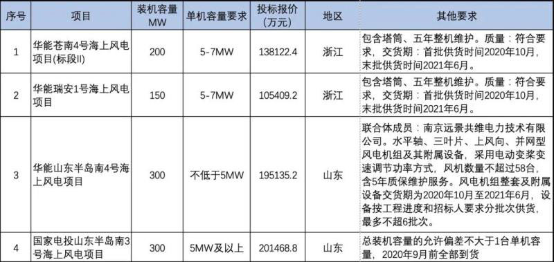 5月22日,華能集團(tuán)發(fā)布2個海上風(fēng)電項目中標(biāo)公示,遠(yuǎn)景能源以243531.60萬元中標(biāo),單機(jī)要求5-7MW,均包含塔筒、五年整機(jī)維護(hù)。其中華能蒼南4號海上風(fēng)電項目(標(biāo)段II)裝機(jī)容量200MW,華能瑞安1號裝機(jī)容量150MW。