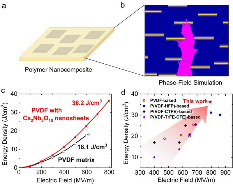 圖例說明:a. 復合材料示意圖。b. 復合材料電擊穿過程的相場模擬中,帶負電Ca2Nb3O10納米片對電樹枝發(fā)展起阻礙作用。c. PVDF基復合材料與純PVDF的儲能密度與電場的關(guān)系。d. 不同聚合物基納米復合材料的擊穿強度和能量密度的對比。