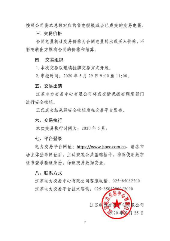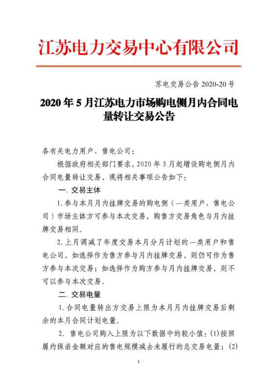 2020年5月江蘇電力市場(chǎng)購(gòu)電側(cè)月內(nèi)合同電量轉(zhuǎn)讓交易公告