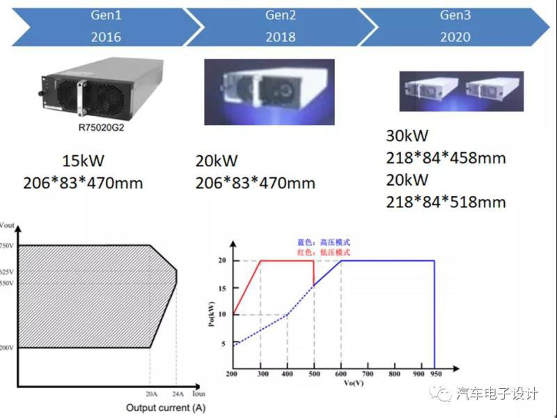 在整個直流快充模塊的降價和提高性能方面的過程中,華為扮演了一個挺有意思的角色。如下圖所示的華為充電模塊的Roadmap來看,是從開始的750V 15kW充電模塊,演化為500V&950V雙平臺的20kW模塊,到現(xiàn)在的國內(nèi)版30kW充電模塊和國外版20kW充電模塊。