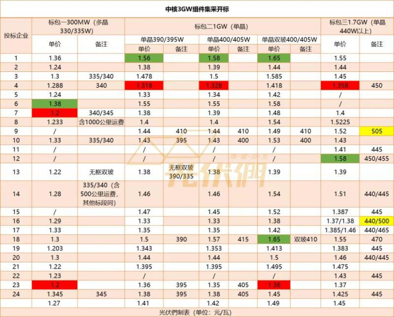 5月27日,中核集團(tuán)2020年第一批組件集采今日開(kāi)標(biāo),招標(biāo)規(guī)模共計(jì)3GW,分為三個(gè)標(biāo)段,共計(jì)24家組件企業(yè)參與投標(biāo)。具體開(kāi)標(biāo)結(jié)果見(jiàn)下: