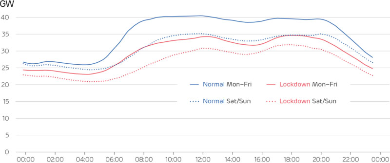 三月和四月每日平均電力需求變化,包括正常年份(2015-19年)與封鎖期間進(jìn)行比較