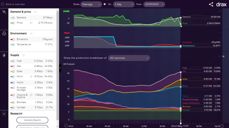 英國公用事業(yè)公司Drax旗下電力監(jiān)測系統(tǒng)Electric Insights數(shù)據(jù)顯示,在上個(gè)周末(5月23日至24日)前,英國電力部門的負(fù)電價(jià)和二氧化碳排放雙雙創(chuàng)下歷史新低。
