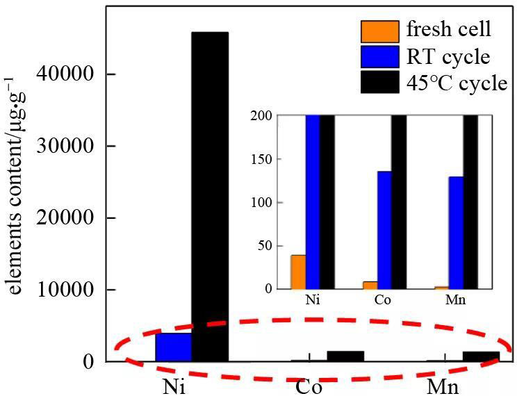 鋰離子電池正極材料過(guò)渡金屬溶出并沉積在負(fù)極是電池容量衰減的一大原因。因此對(duì)循環(huán)前后的負(fù)極刮粉,利用ICP對(duì)負(fù)極片沉積的主元素進(jìn)行了測(cè)試。結(jié)果證明循環(huán)后負(fù)極片上沉積的主元素含量顯著增多,尤其是高溫循環(huán)后過(guò)渡金屬溶出含量大幅增長(zhǎng)。而正極材料中的過(guò)渡金屬溶解,會(huì)經(jīng)電解液擴(kuò)散到負(fù)極表面然后發(fā)生還原反應(yīng),破壞負(fù)極SEI膜導(dǎo)致其持續(xù)生長(zhǎng),導(dǎo)致活性L(fǎng)i 損失和電池阻抗的增加。近日華南師范大學(xué)的Wang等[4]研究表明,二價(jià)Mn元素溶解在電解液中時(shí),由于其獨(dú)特的溶劑化結(jié)構(gòu)會(huì)對(duì)碳酸酯溶劑和六氟磷酸根造成嚴(yán)重的破壞,從而造成鋰離子電池性能的持續(xù)衰減。