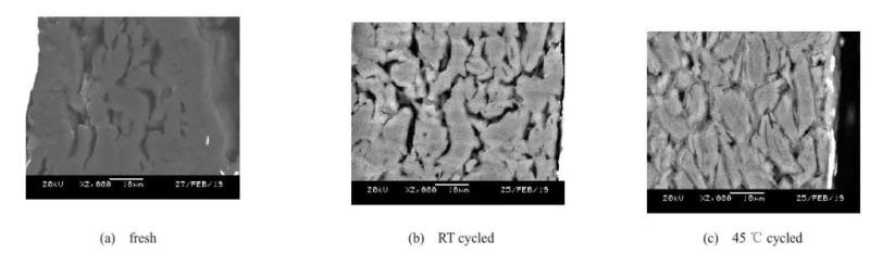 SEM電鏡照片表明,正極材料循環(huán)后出現(xiàn)了大面積明顯的微裂紋乃至裂紋,高溫循環(huán)后的材料更是出現(xiàn)了嚴(yán)重的粉化現(xiàn)象。這主要是由于在反復(fù)充放電過(guò)程中,晶胞不斷地膨脹收縮,導(dǎo)致正極材料顆粒結(jié)構(gòu)斷裂、粉化,致使活性粒子之間接觸不良,增加電池內(nèi)阻,并且材料比表面積增加,加劇了與電解液的副反應(yīng),導(dǎo)致材料失效。而在高溫循環(huán)后,負(fù)極表面的SEI膜也顯著增厚,造成Li+的消耗及電池內(nèi)阻的增長(zhǎng)。