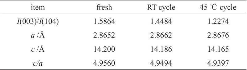 根據(jù)正極材料常溫和高溫循環(huán)以后的XRD譜圖結(jié)果以及晶胞參數(shù)計(jì)算,如表1和圖3所示,材料的晶體結(jié)構(gòu)發(fā)生一定程度的劣化。