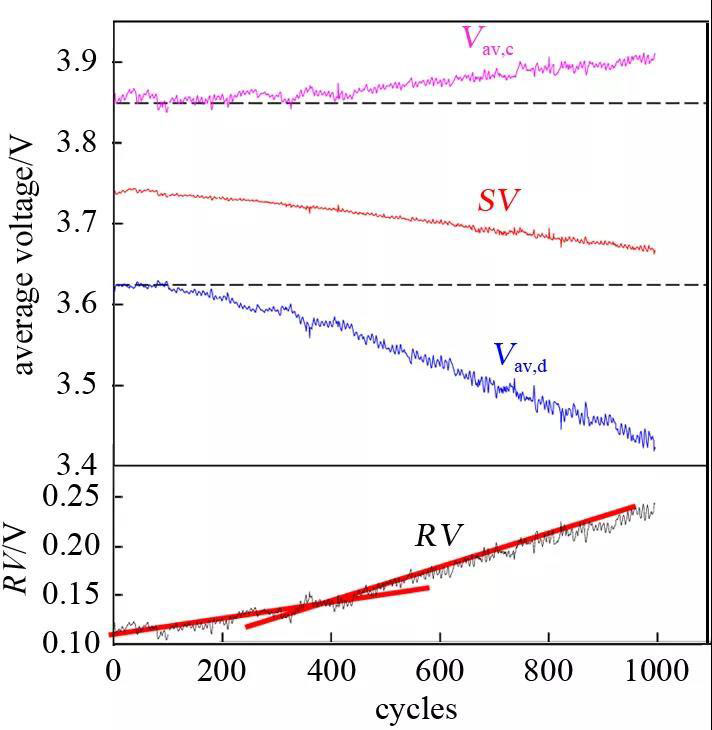 如圖2所示,當(dāng)電池循環(huán)到400次時(shí),RV上升斜率發(fā)生變化,其上升速率加快,而SV隨循環(huán)次數(shù)增加反而呈下降趨勢(shì),說(shuō)明電芯衰減的原因主要來(lái)自于電芯內(nèi)阻的升高,而非活性L(fǎng)i損失。