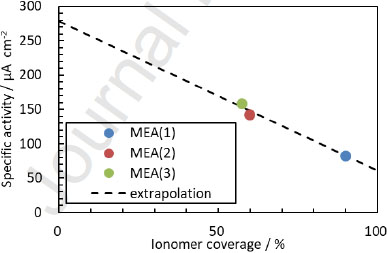 如果聚合物覆蓋率為??的Pt催化劑比活性SA可假定為聚合物覆蓋和未覆蓋區(qū)域比活性的線性加權(quán)平均值,則應(yīng)表示為:SAave(??)=??×SAion+(1-??)×SAbare。SAion和SAbare分別為聚合物覆蓋和未覆蓋Pt催化劑的比活性。從上述公示可以看出,可通過擬合直線估算出SAion和SAbare,即SAion=61 μC·cm-2和SAbare=278 μC·cm-2。
