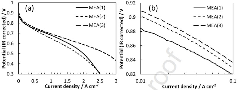 上圖分別顯示了根據(jù)CO消除電荷估算的在電位掃描期間MEA(2)和MEA(3)的ECSA,計算方法與MEA(1)相同。MEA(2)的兩個樣本ECSA分別為53%和67%,而MEA(3)分別為57%和58%。對于非多孔碳載體MEA(1),幾乎所有的Pt納米顆粒都位于碳載體外表面上,并傾向于被聚合物覆蓋。相反,對于多孔碳載體MEA(2)和MEA(3),有更多的Pt納米顆粒位于碳載體內(nèi)表面和未被聚合物覆蓋的區(qū)域。