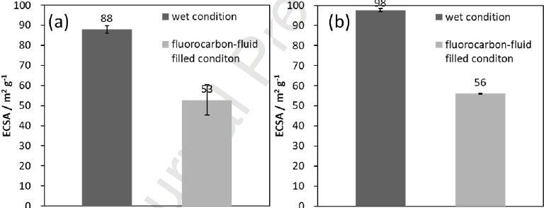 濕操作和碳氟化合物流體填充條件下從CO氧化電流估算得出的MEA(2,a)和MEA(3,b)的ECSA(兩樣本平均值)
