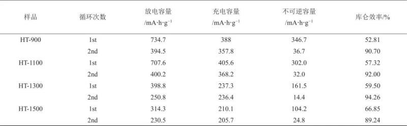 圖6所示為HT-x電極在0.1 C電流密度下鋰離子電池恒流充放電曲線,充放電數(shù)據(jù)列于表3中。首次放電曲線在較高電位下出現(xiàn)的平臺對應(yīng)SEI膜的生成,隨著炭化溫度的升高,平臺的長度變短,表明高溫炭化條件下生成的SEI膜消耗的不可逆容量較少,首次庫侖效率提高。由表3中可以看出,HT-x電極的首次庫侖效率由52.81%增加至66.85%。首次充放電過程中(0.1 C),HT-900、HT-1100、HT-1300、HT-1500電極的可逆放電比容量分別為388 mA·h/g、405.6 mA·h/g、237.3 mA·h/g、210.1 mA·h/g,不可逆容量隨著炭化溫度的升高而降低,說明與炭化溫度較高時,缺陷和雜原子含量的降低及石墨微晶層間距的減小有關(guān)。與首次充放電數(shù)據(jù)相比,第二次充放電時,不可逆容量明顯減小,庫倫效率增加,表明SEI膜的生成主要發(fā)生在首次充放電中,后續(xù)循環(huán)過程中電極具有高度可逆性。