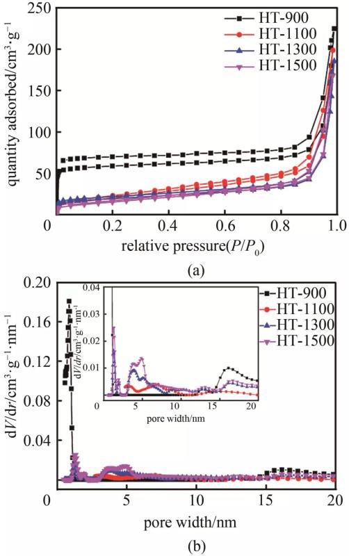 圖4 菱角殼基硬炭的(a) N2吸脫附曲線和(b)孔徑分布