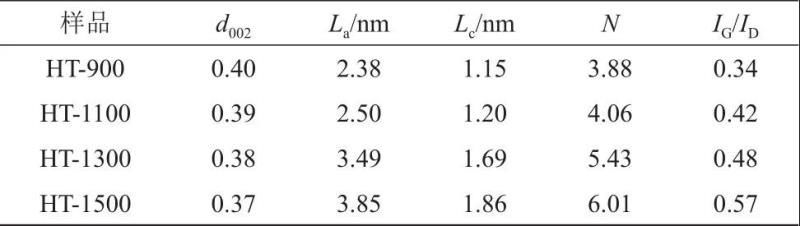 由圖4可知,HT-x樣品的N2吸脫附曲線為IV型,首先在低壓區(qū)就有一定吸附,相對壓力接近1.0時,吸附量迅速增加,脫附曲線和吸附曲線形成遲滯回線,表明樣品中包含介孔和大孔結(jié)構(gòu)。在相同壓力下,HT-900的N2吸脫附量高于其他三個樣品,且從孔徑分布圖可以看出其孔徑主要分布在0.8~1.2 nm,說明HT-900的比表面積相對較大,且包含了較多的微孔結(jié)構(gòu)。由4(a)中的N2吸脫附測試曲線計算可以得到HT-900、HT-1100、HT-1300、HT-1500樣品的比表面積分別為300.94 m2/g、76.82 m2/g、68.29 m2/g、56.71 m2/g。由4(b)孔徑分布圖可以看出,HT-x樣品具有連續(xù)的孔分布,包含微孔、介孔和大孔,這樣的孔結(jié)構(gòu)有利于鋰離子的儲存和擴散。表2列出了HT-x的元素含量,隨著炭化溫度的升高,碳元素含量逐漸增加,而氧、氮、氫含量逐漸降低,表明隨炭化溫度升高,石墨微晶結(jié)構(gòu)中的官能團和缺陷進一步減少,有序度增加。