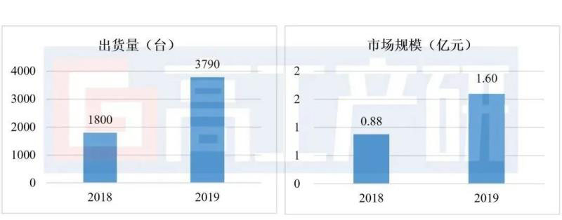2018-2019年中國市場氫燃料電池空壓機(jī)出貨量及市場規(guī)模(臺(tái),億元)