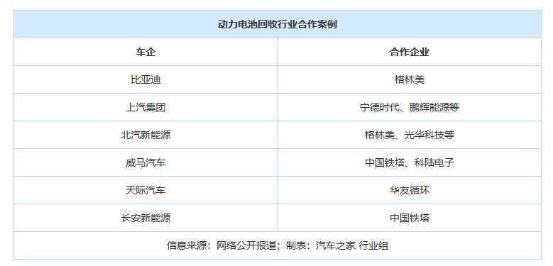 羅蘭貝格管理咨詢公司執(zhí)行總監(jiān)吳釗看來,具備客戶和渠道基礎(chǔ)是解決動力電池回收問題的核心,考慮到電池回收的運營體系復雜性,目前市場上主流做法為“抱團合作”,即車企、電池企業(yè)及回收企業(yè)達成戰(zhàn)略合作,利用各自的優(yōu)勢,解決動力電池回收難題。