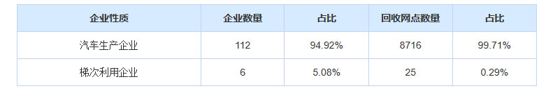 汽車之家統(tǒng)計出工信部公布的動力電池回收網(wǎng)點情況,截至2020年5月,全國共有回收服務網(wǎng)點8741個,其中涉及整車企業(yè)112家,梯次利用企業(yè)6家。從網(wǎng)點分布情況來看,車企建立的回收網(wǎng)點占據(jù)絕大部分數(shù)量,在全國各地均有覆蓋。從具體網(wǎng)點來看,以汽車企業(yè)4S店網(wǎng)絡(luò)為主,也有少部分與車企合作的報廢拆解企業(yè)建立的網(wǎng)點,以及梯次利用企業(yè)建立的網(wǎng)點。