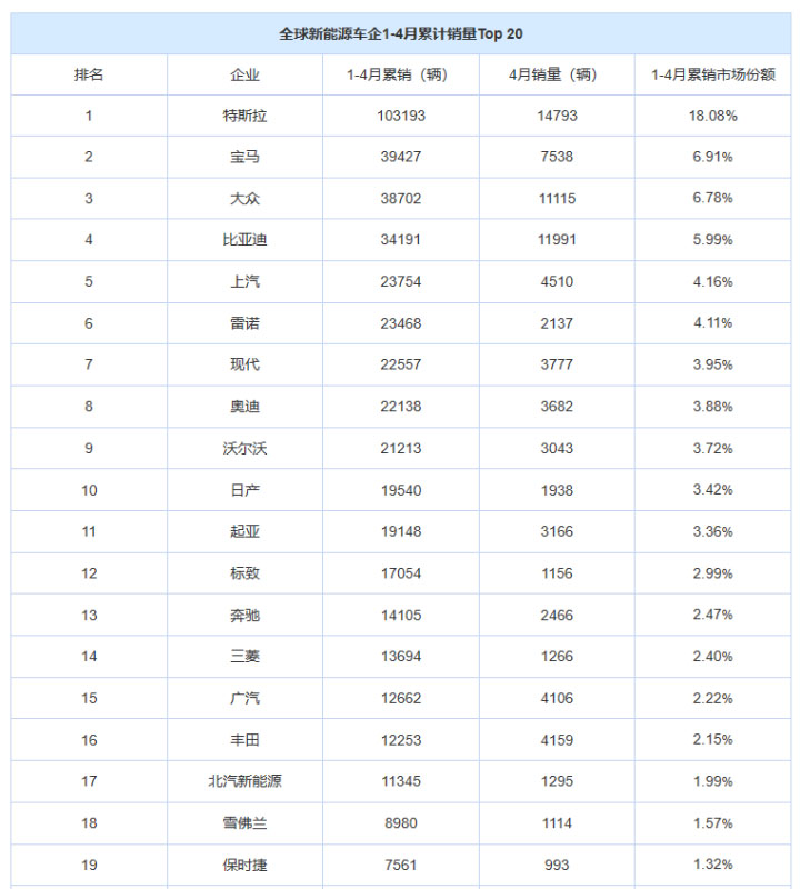 總結(jié)全文:就全球來看,新能源汽車雖是各企業(yè)布局的重點領(lǐng)域之一,但其銷量也受到了疫情等影響,1-4月以累銷57萬輛同比減少29%。從競爭格局看,傳統(tǒng)跨國車企如大眾、寶馬今年表現(xiàn)突出,比亞迪和北汽新能源此前常進前三強的中國選手,由于傳統(tǒng)跨國車企強勢上榜被擠出高位。