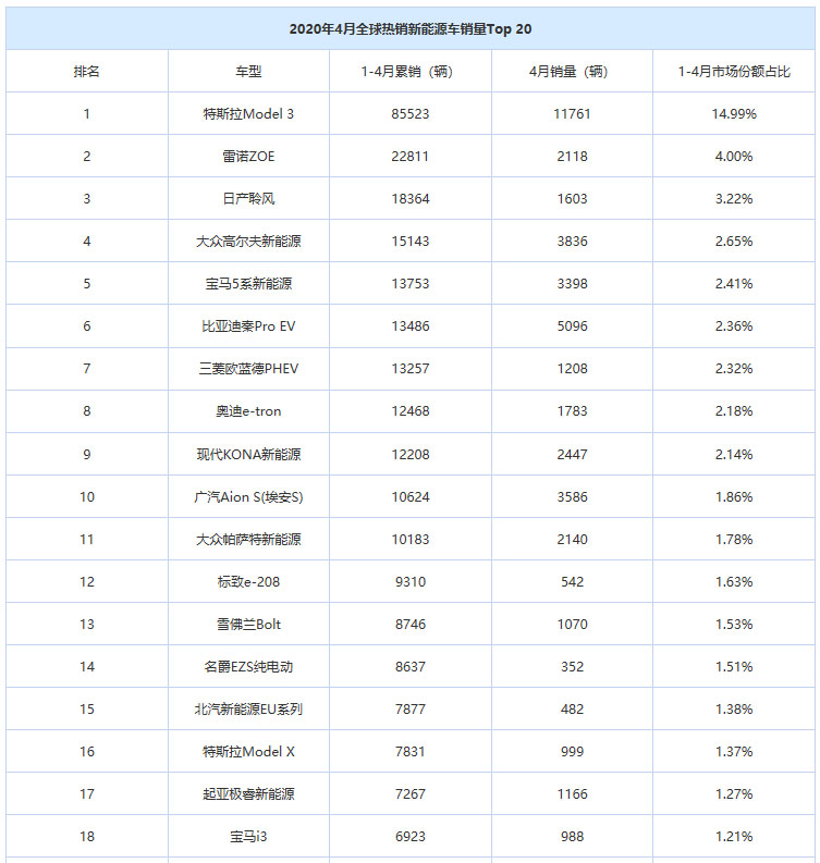 從累計銷量看,Model 3則以1-4月累銷8.55萬輛的成績,超出第二名雷諾ZOE共計6.27萬輛,占全球市場份額的15%;對比來看,累銷第二名的雷諾ZOE以2.28萬輛占全球4%的市場份額。