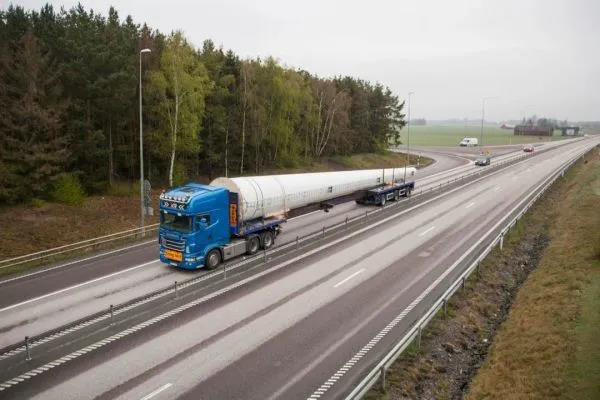 △ 運輸木制風力發(fā)電塔,圖片來自Modvion