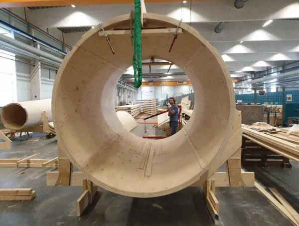 它的建造者是瑞士一家名為Modvion的公司,主要開發(fā)模塊化設計的工程木材技術。發(fā)電塔的構件在膠合木工廠內完成加工生產,然后運輸?shù)浆F(xiàn)場進行安裝。