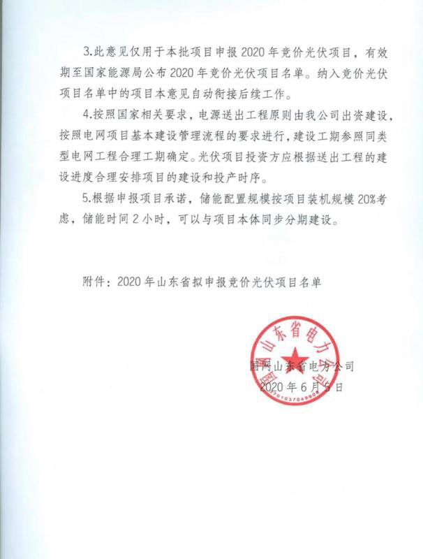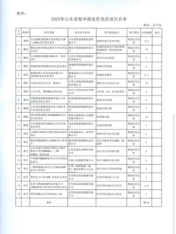 6月5日,國網(wǎng)山東發(fā)布《關(guān)于2020年擬申報(bào)競價(jià)光伏項(xiàng)目意見的函》,其中公布了2020年山東參與競價(jià)的光伏電站項(xiàng)目共計(jì)19個(gè)項(xiàng)目規(guī)模為97.6萬千瓦,并且根據(jù)申報(bào)項(xiàng)目承諾,將按項(xiàng)目裝機(jī)規(guī)模20%考慮配置儲(chǔ)能,儲(chǔ)能時(shí)間2小時(shí),可以與項(xiàng)目本體同步分期建設(shè)。預(yù)計(jì)儲(chǔ)能此批儲(chǔ)能總規(guī)模將達(dá)195.2MW/390.4MWh。詳細(xì)文件如下: