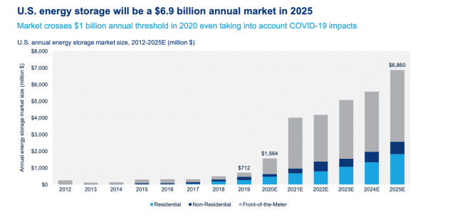 盡管Brett Simon表示,Wood Mackenzie公司由于疫情已經(jīng)下調(diào)了對(duì)今明兩年的儲(chǔ)能市場預(yù)測,但目前仍然預(yù)測,美國2025年儲(chǔ)能部署裝機(jī)容量將達(dá)到7GW。而該公司在今年早些時(shí)候預(yù)測這一數(shù)字將接近7.3GW。