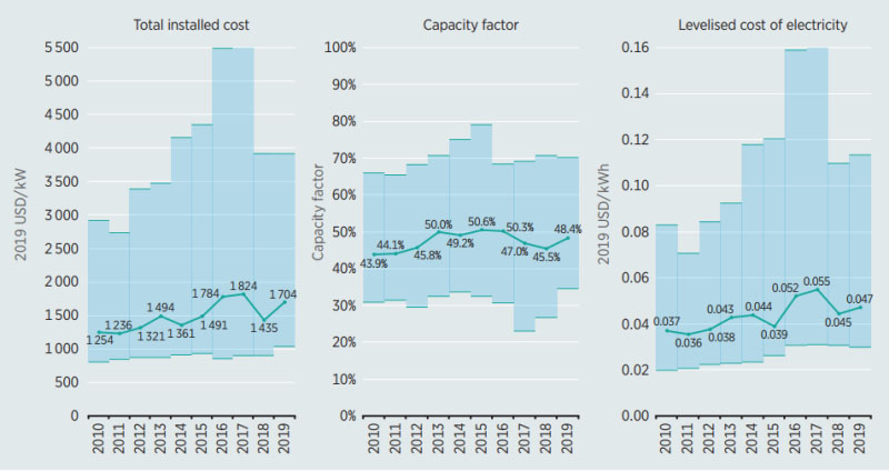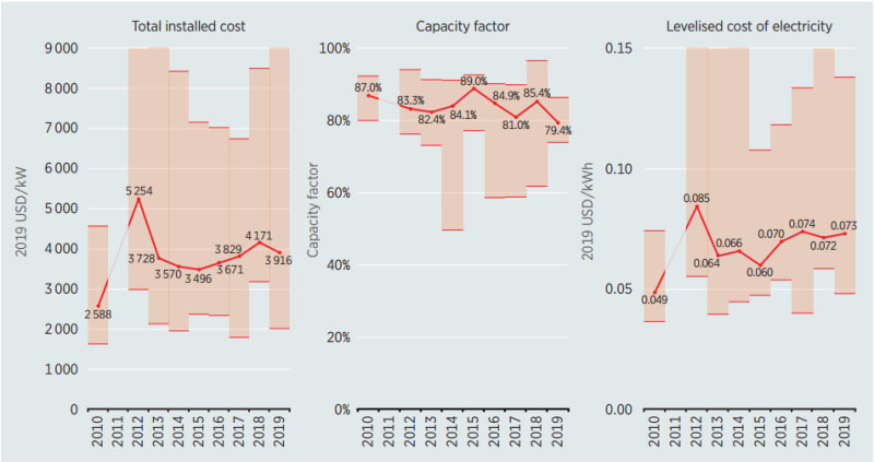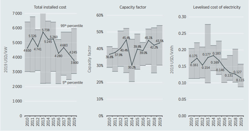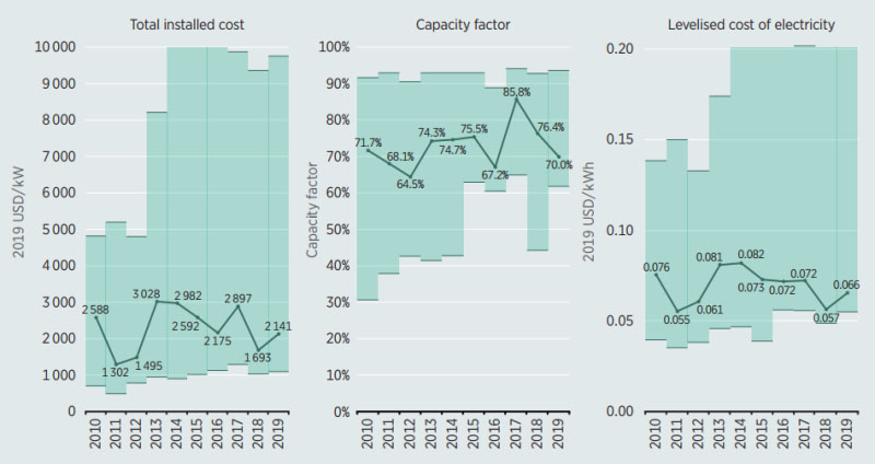 2010-2019年全球地?zé)岚l(fā)電加權(quán)平均總安裝成本、容量因子和LCOE: