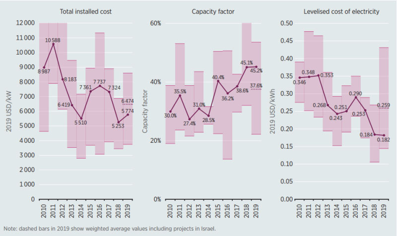 2010-2019年全球光熱發(fā)電加權(quán)平均總安裝成本、容量因子和LCOE: