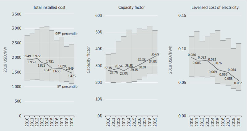 2010-2019年全球海上風(fēng)電加權(quán)平均總安裝成本、容量因子和LCOE: