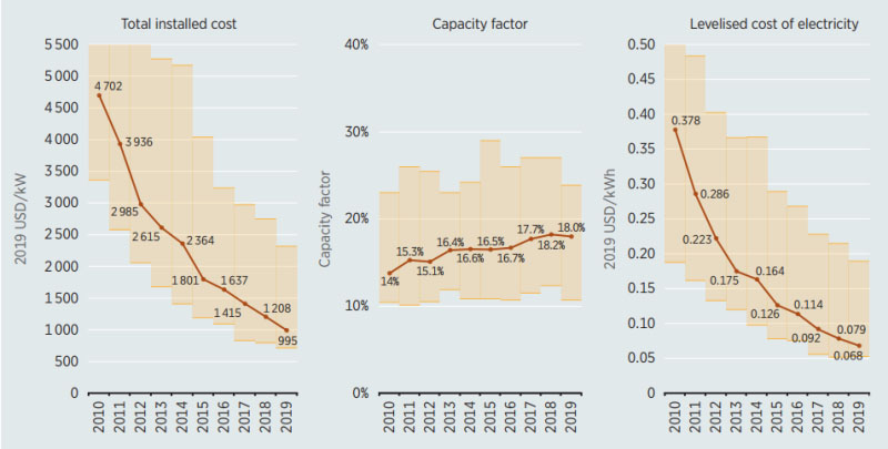 2010-2019年全球太陽能光伏加權(quán)平均總安裝成本、容量因子和LCOE: