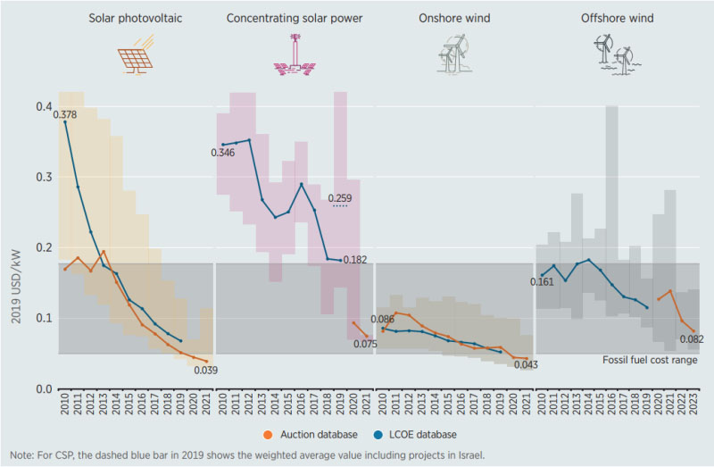 太陽能和風(fēng)能發(fā)電的成本降低趨勢(shì)未出現(xiàn)減弱跡象。競(jìng)拍和購電協(xié)議(PPA)的最新數(shù)據(jù)顯示,在2021年投產(chǎn)的項(xiàng)目中,太陽能光伏發(fā)電的平均價(jià)格可能為0.039美元/千瓦時(shí),與2019年相比下降42%,比使用最便宜化石燃料的競(jìng)爭(zhēng)對(duì)手(即燃煤發(fā)電廠)低五分之一以上。到2021年,陸上風(fēng)電的價(jià)格可能會(huì)降至0.043美元/千瓦時(shí),比2019年下降18%。與此同時(shí),海上風(fēng)電和光熱發(fā)電項(xiàng)目將面臨較大的變化,其全球平均拍賣價(jià)格將分別較2019年下降29%和59%,將分別降至0.082美元/千瓦時(shí)(2023年)和0.075美元/千瓦時(shí)(2021年)。