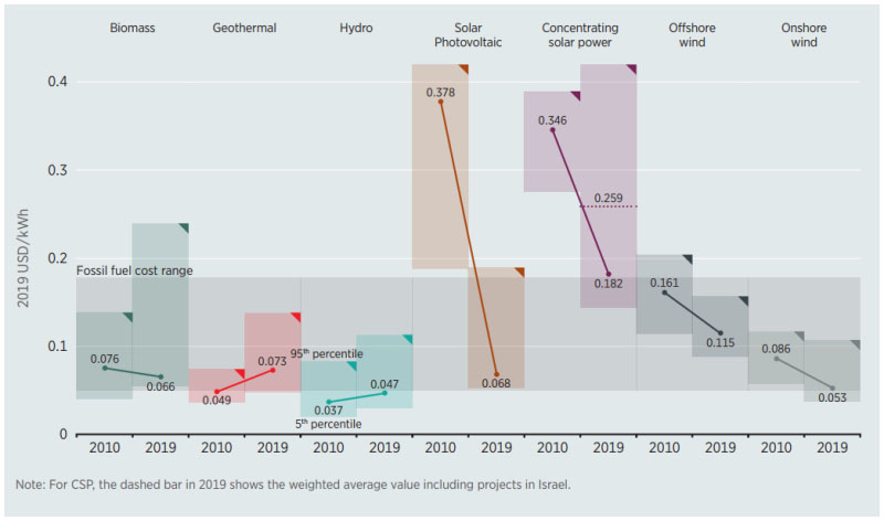 新近投產(chǎn)的水力發(fā)電項(xiàng)目的全球加權(quán)平均平準(zhǔn)化度電成本LCOE從2010年的0.037美元/千瓦時(shí)增至2019年的0.047美元/千瓦時(shí)。盡管如此,水力發(fā)電仍然非常具有競(jìng)爭(zhēng)力,在2019年投產(chǎn)的所有發(fā)電容量中,有十分之九的發(fā)電成本都低于使用最便宜的新建化石燃料發(fā)電項(xiàng)目。2019年,地?zé)岚l(fā)電成本約為0.073美元/千瓦時(shí),生物質(zhì)發(fā)電成本約為0.066美元/千瓦時(shí),這些技術(shù)提供穩(wěn)定的電力供應(yīng)并且發(fā)電容量的成本與新建化石燃料發(fā)電成本范圍的下限相當(dāng)。
