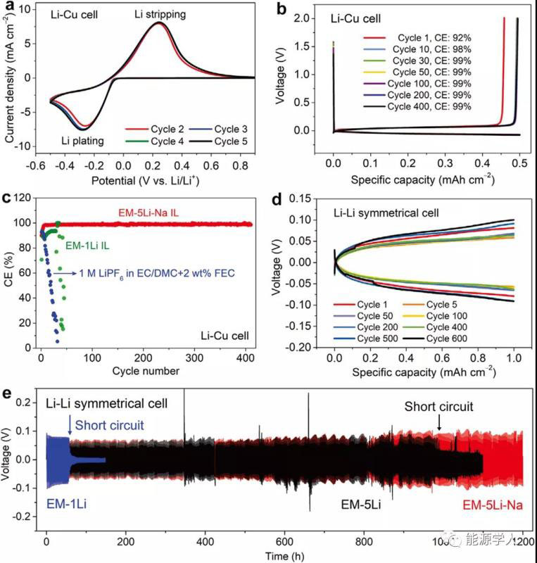 圖2 不同離子液體電解液的電化學性能。a)采用 EM-5Li-Na IL電解液的Li-Cu電池的CV曲線,掃描速率為2mvs?1。b) 使用EM-5Li-NaIL電解液的Li-Cu電池進行Li沉積/溶解時的充放電曲線。c)分別采用傳統(tǒng)有機電解液、EM-1Li和EM-5Li-Na IL電解液時Li-Cu電池中Li沉積/溶解的庫侖效率。(b,c)中電流密度和面積比容量分別為0.5 mA cm?2和0.5 mAh cm?2。d)使用EM-5Li-Na IL電解液的Li/Li對稱電池在不同循環(huán)次數(shù)下的Li沉積/溶解曲線。e)分別采用EM-1Li、EM-5Li和EM-5Li-Na IL電解液時Li /Li對稱電池的Li沉積/溶解曲線。(e,f)中電流密度和面積比容量分別為1 mA cm?2和1 mAh cm?2。