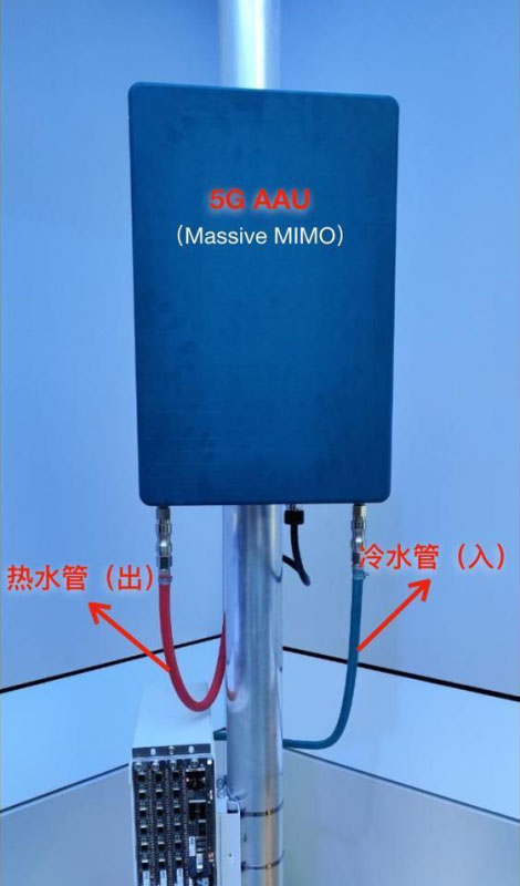 從上圖看,5G AAU配置了冷水管(入)和熱水管(出),通過(guò)液冷自循環(huán)降溫。