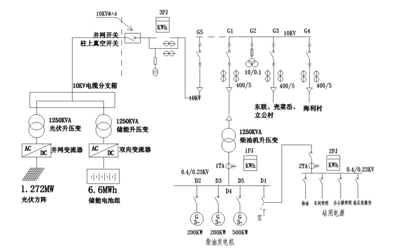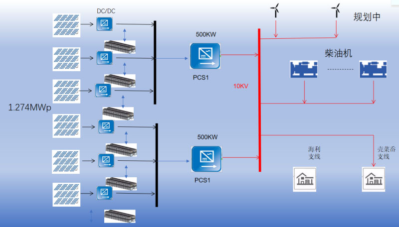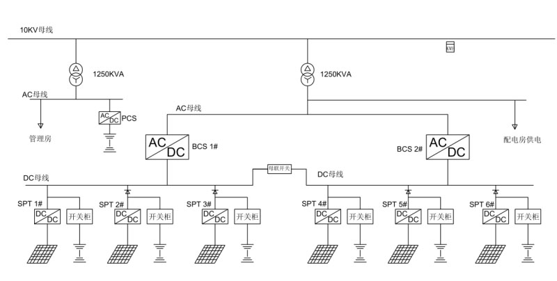 光伏系統(tǒng)(1.274MWp)與儲(chǔ)能系統(tǒng)(7.239MWh)總直流母線連接,并由2臺(tái)BCS逆變器升至400Vac交流母線,并經(jīng)0.4/10.5kV升壓變升壓至10kV輸電線路接入用戶側(cè)。