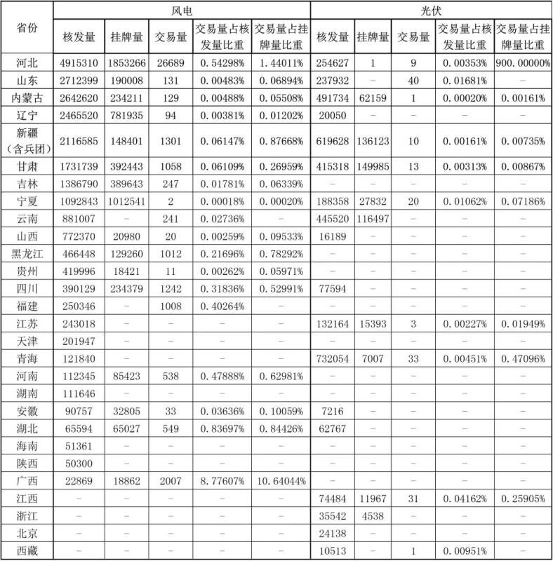 中國(guó)綠色電力證書(shū)認(rèn)購(gòu)交易平臺(tái)顯示,自實(shí)行綠證核發(fā)及交易以來(lái),全國(guó)共核發(fā)風(fēng)電綠證23315779張(約23.32億千瓦時(shí))、光伏綠證3845828張(約3.85億千瓦時(shí)),風(fēng)電綠證掛牌量為5607605張、光伏綠證掛牌量為531502張,風(fēng)電綠證成交量為36312張、光伏綠證成交量為161張。其中風(fēng)電交易量占核發(fā)量的0.156%、交易量占掛牌量的0.648%,光伏交易量占核發(fā)量的0.0042%、交易量占掛牌量的0.03%。全國(guó)各省份綠證核發(fā)及交易情況詳見(jiàn)圖1~6、表1。